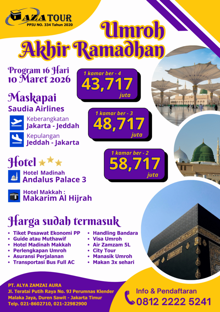 Aza Tour & Travel adalah penyelenggara ibadah Umrah & Haji yang telah memiliki izin resmi dari Kementerian Agama RI. Jamaah bisa berangkat dengan tenang, tanpa khawatir soal legalitas dan keamanan perjalanan.