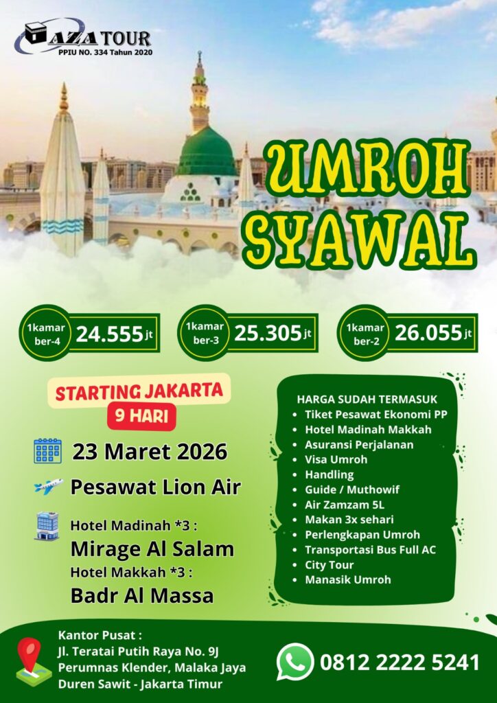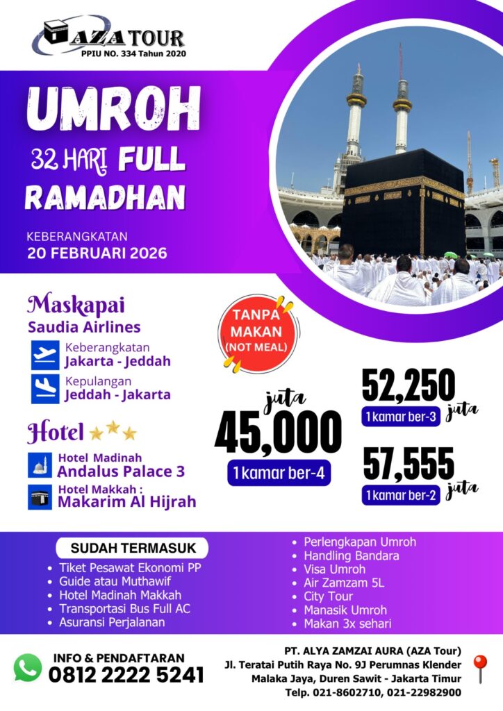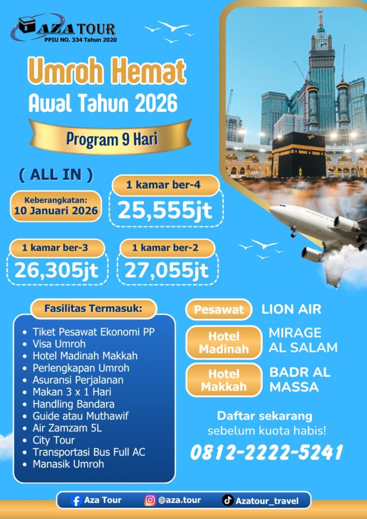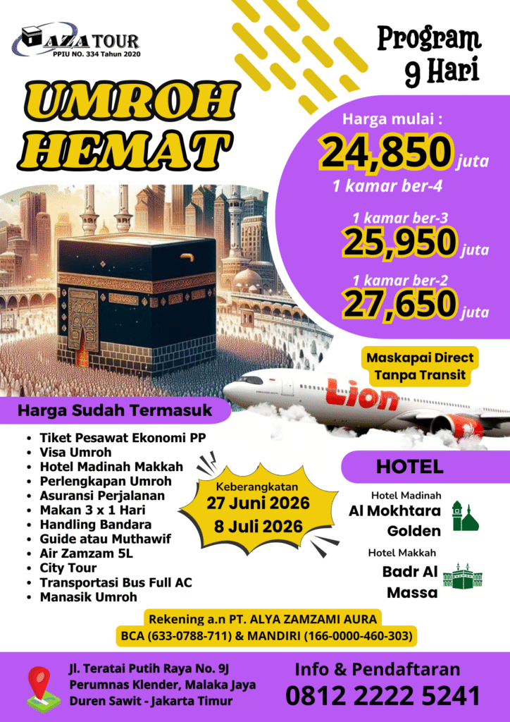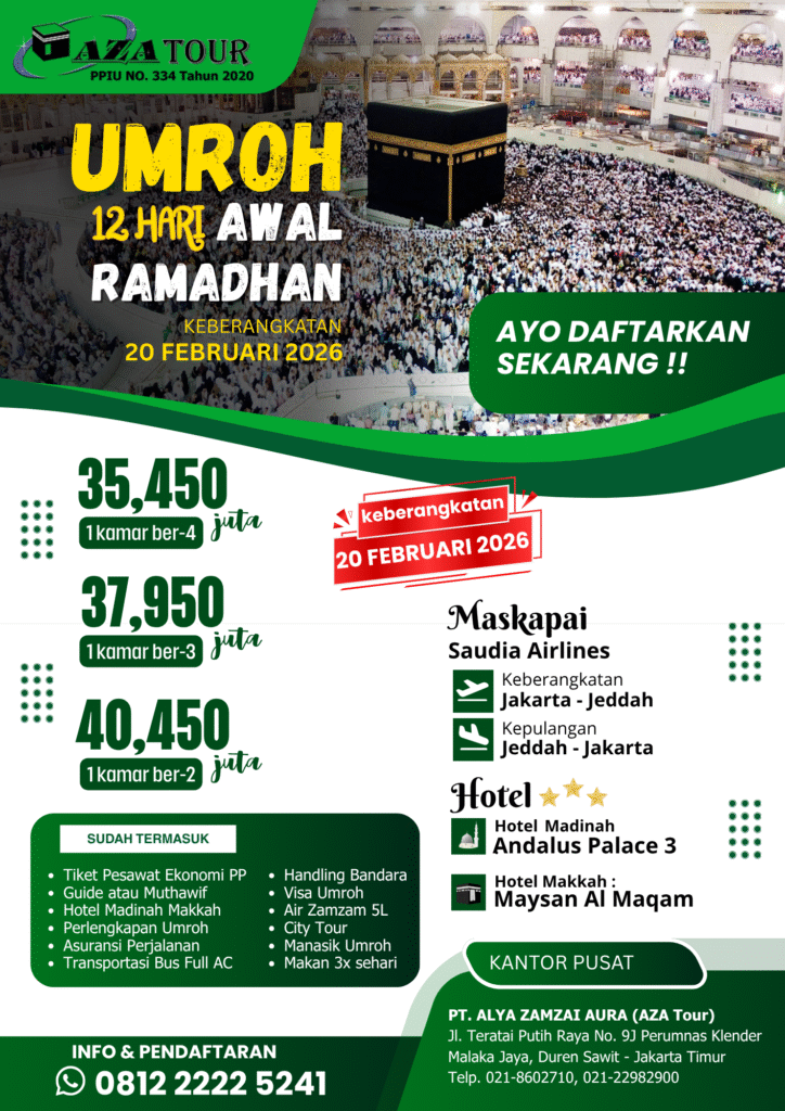 Kami adalah biro perjalanan terpercaya yang siap menemani setiap langkah Anda — mulai dari perjalanan ibadah seperti Umroh dan Haji. Dengan pengalaman, pelayanan profesional, dan harga yang kompetitif, Aza Tour & Travel hadir untuk memberikan kenyamanan, keamanan, dan kepuasan di setiap perjalanan Anda.
